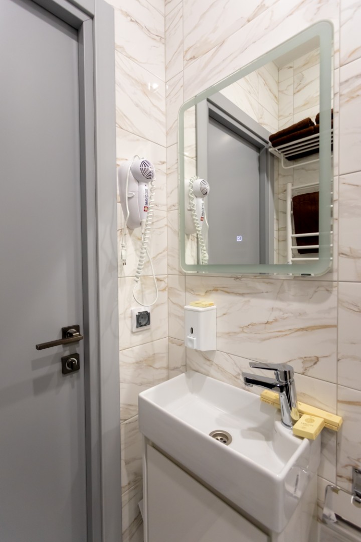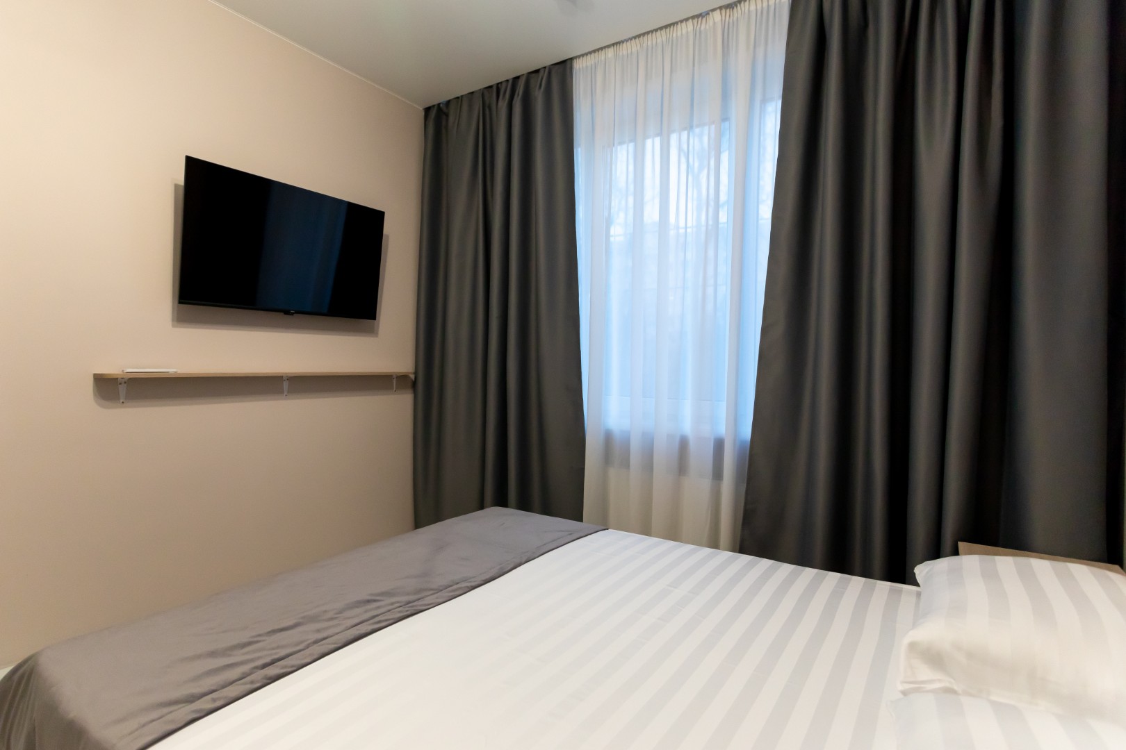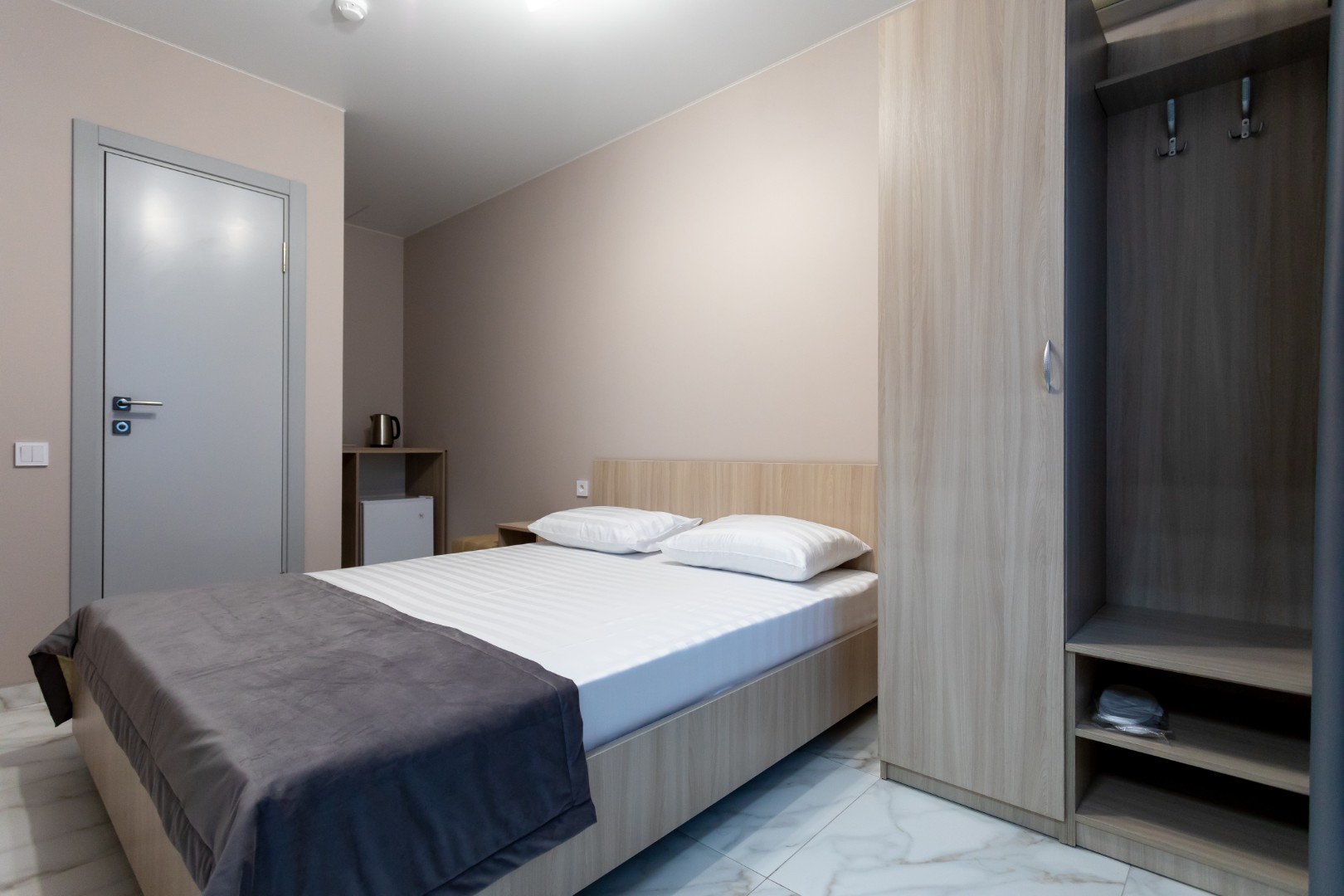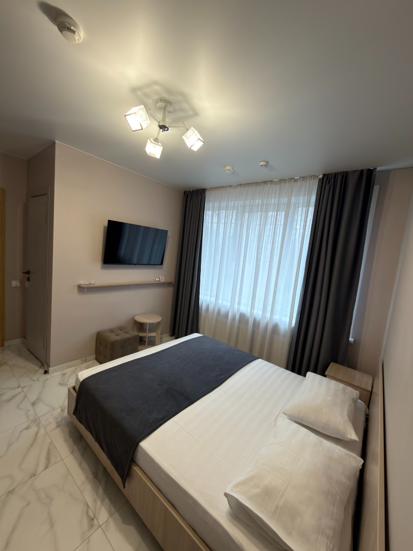 В номере: Двуспальная кровать, прикроватные тумбочки, электрический чайник, мини-холодильник, ЖК телевизор, телефон.