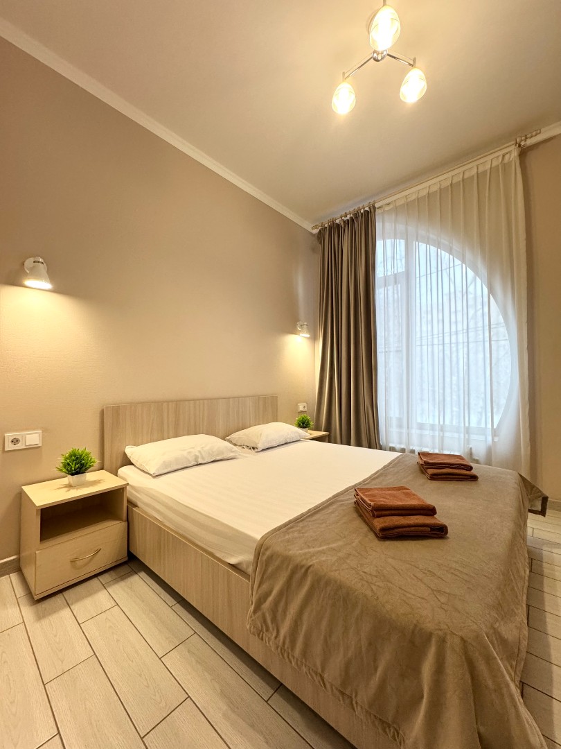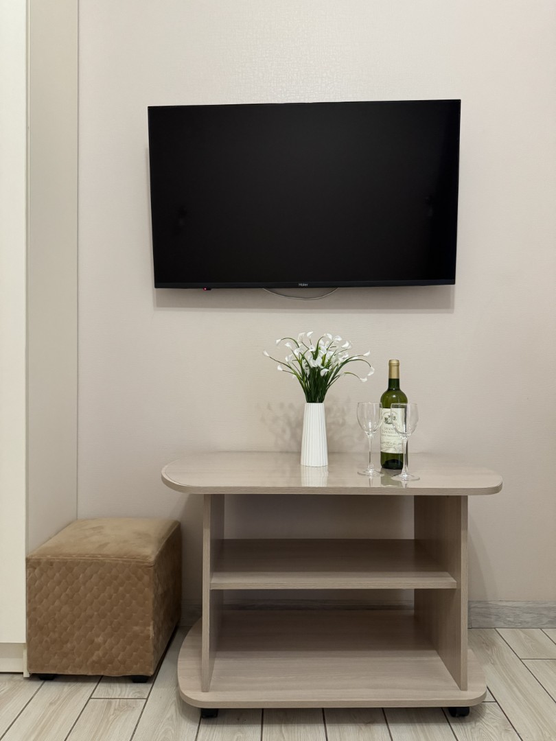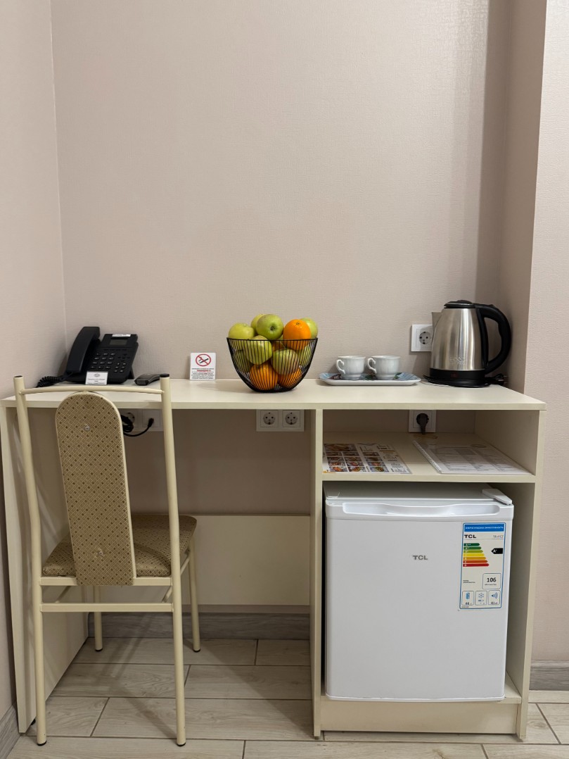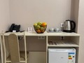 В номере: Двуспальная кровать, прикроватные тумбочки, электрический чайник, мини-холодильник, ЖК телевизор, телефон.